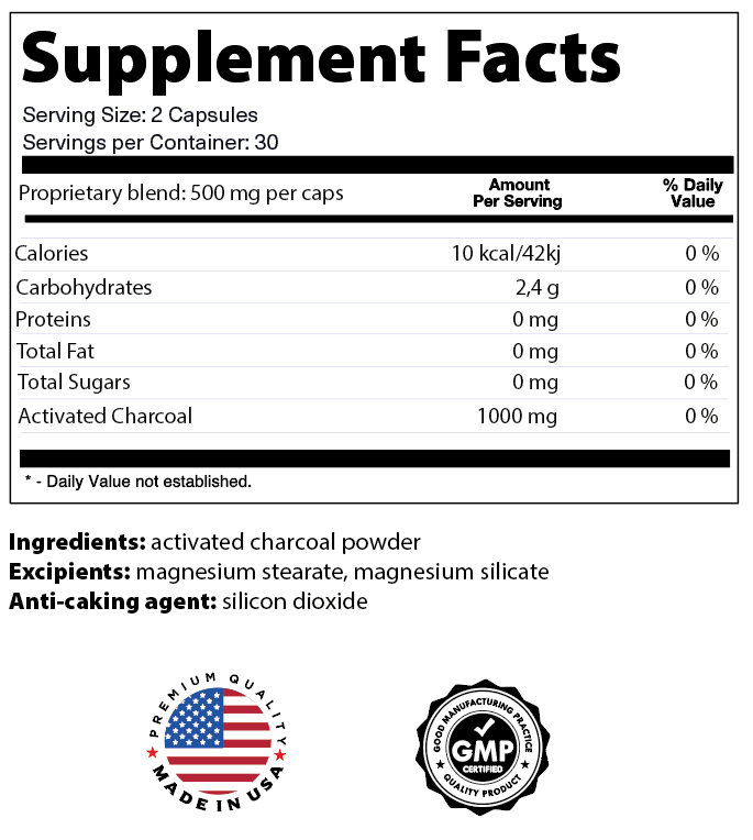 Cada porção de 2 cápsulas contém 1000 mg de carvão ativado puro, com apenas 10 kcal por dose. É um suplemento isento de gorduras, proteínas e açúcares, contendo apenas 2,4 g de carboidratos — ideal para quem busca uma rotina mais leve e funcional.